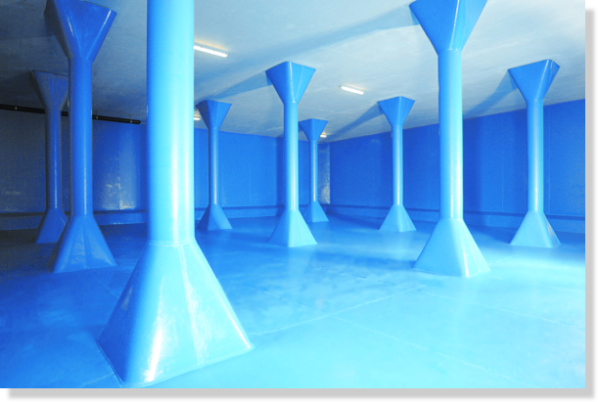 Резервуар для хранения питьевой воды полностью и бесшовно облицован полипропиленовыми панелями. Колонны интегрированы в общую облицовку с помощью термически формованных специальных переходных деталей.